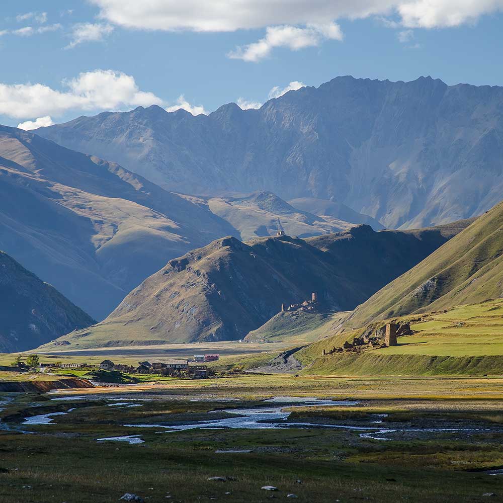 4WD drive to Kvemo Okrokana (2050 m) and trek into Truso Valley, discovering mineral springs, colorful soils, abandoned stone villages, and beautiful open valleys. (Optional) return via the Kobi cable car. Overnight in Stepantsminda. Breakfast included.